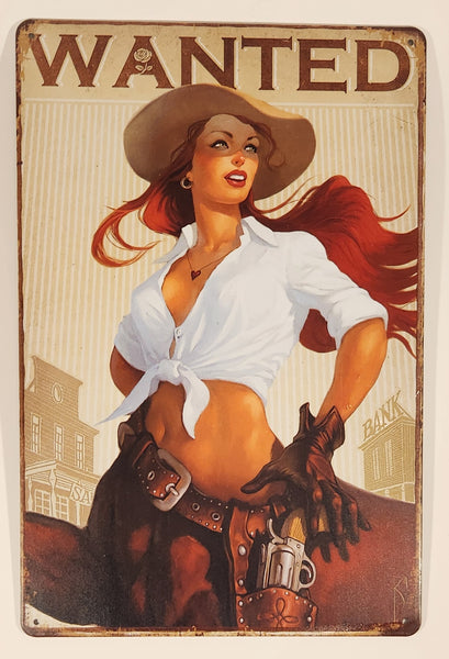 Wanted Wild West Cowgirl with Red Hair Reaching for Revolver in Holster 7 3/4" x 11 3/4" Tin Metal Sign