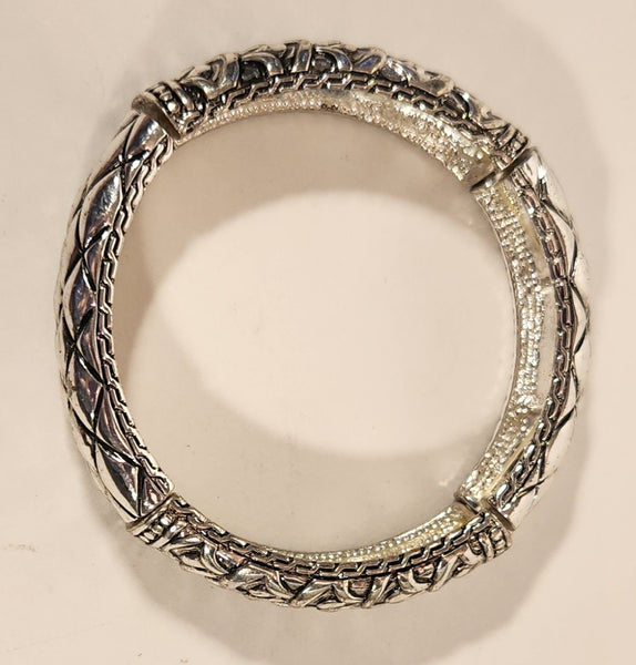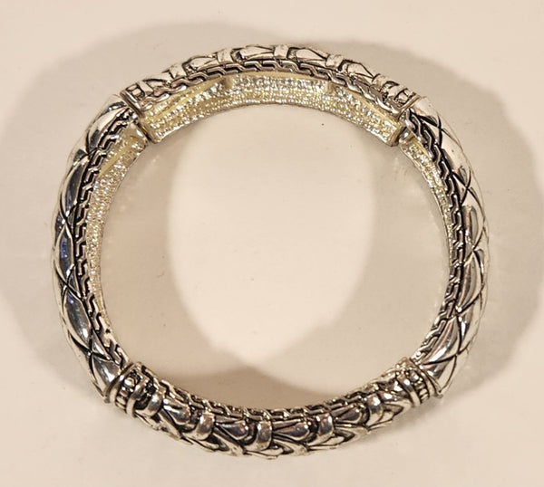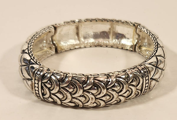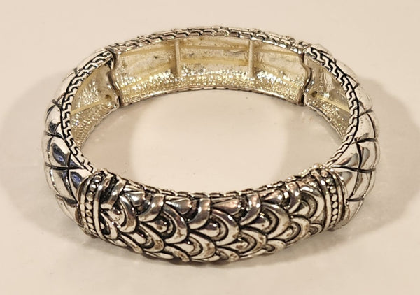 Alternating Ornate Pattern Silver Tone Metal Elastic Bracelet