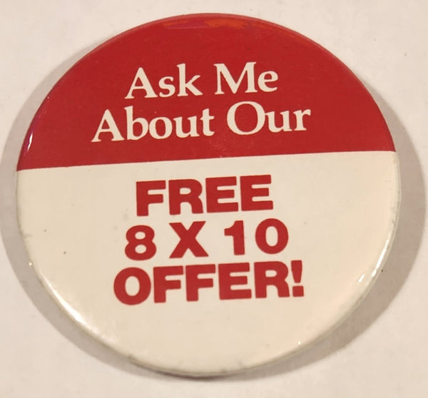 Ask Me About Our Free 8 X 10 Offer! Red and White 2 1/4" Round Button Pin
